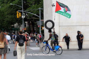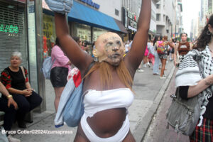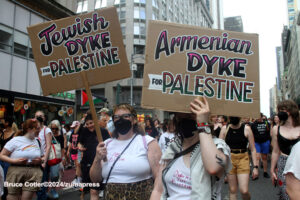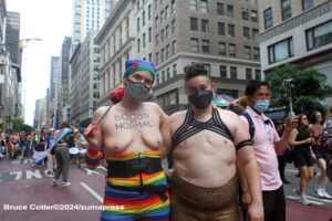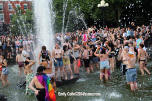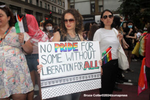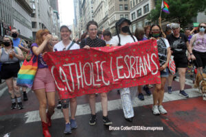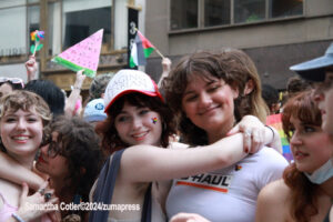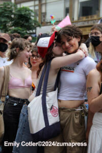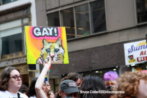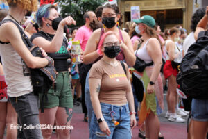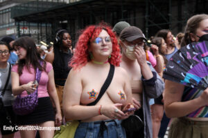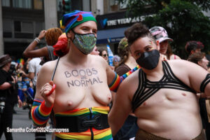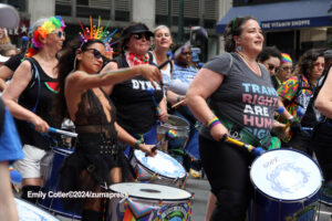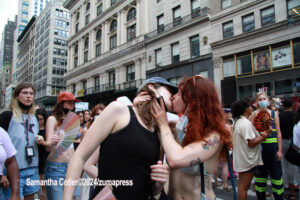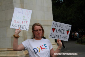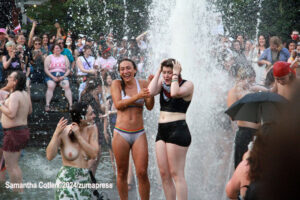 Their rallying cries echoed down the streets and across Washington Square Park as they jumped into the famed fountain– the loudest of which being, “When the Dykes Go Marching In[…]”, sung to the tune of the popular song “When the Saints Go Marching In”. Attendees formed large groups in and around the fountain to prominently display their signs, as well as draw attention to their cause.