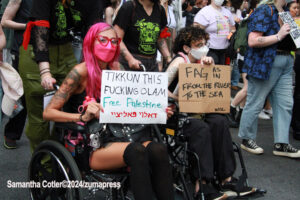 Signs referencing the ongoing conflict in Gaza were aplenty throughout the crowd.