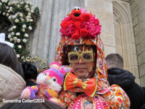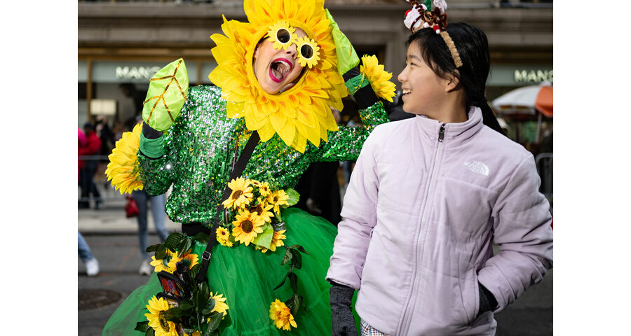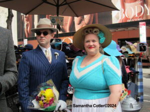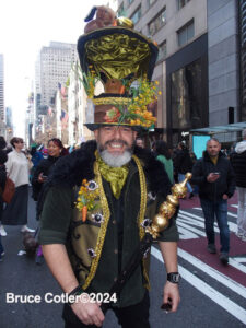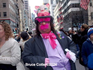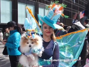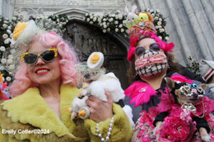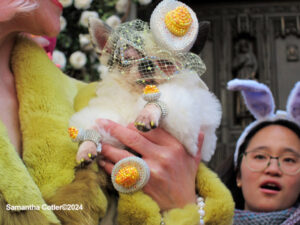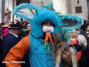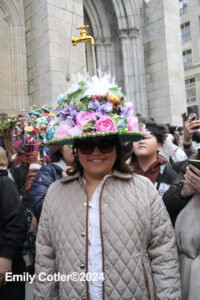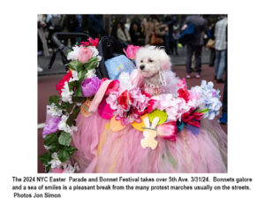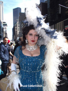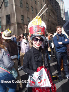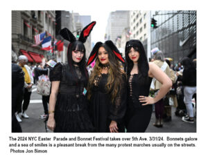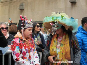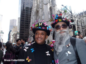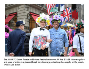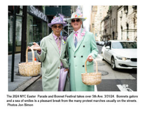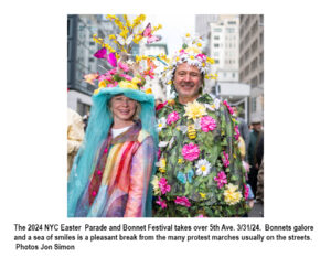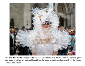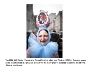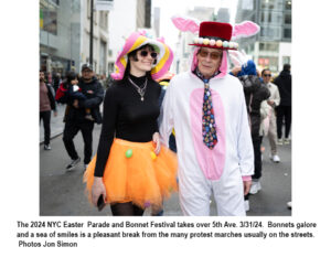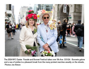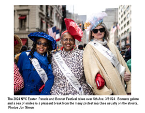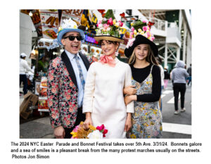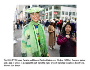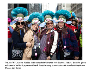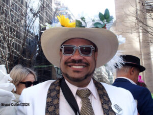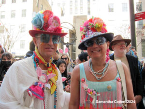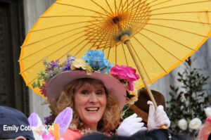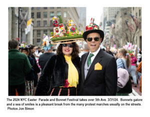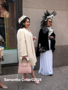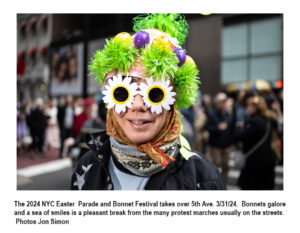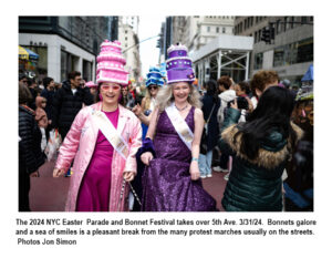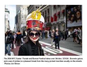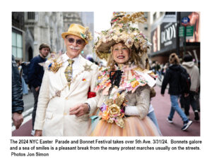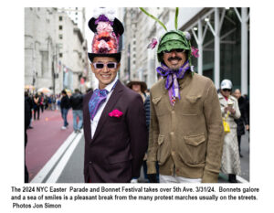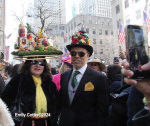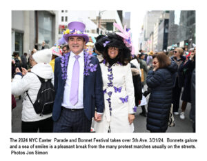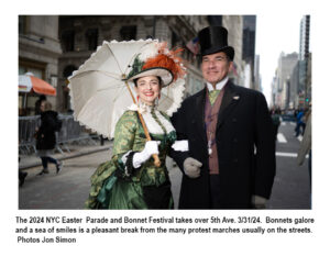 Strolling along Manhattans Fifth Avenue. Crowds of people dressed in their finest hats enjoy the sunny day.